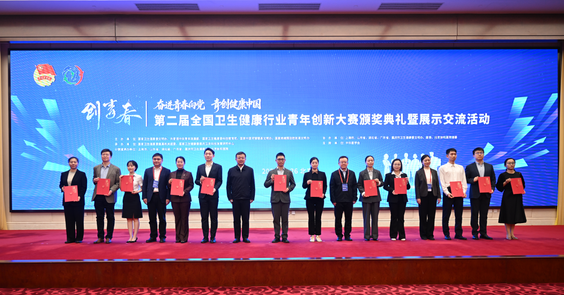 颁奖环节,与会领导为获得“创青春”第二届全国卫生健康行业青年创新大赛金奖、银奖、铜奖的项目代表颁发获奖证书。